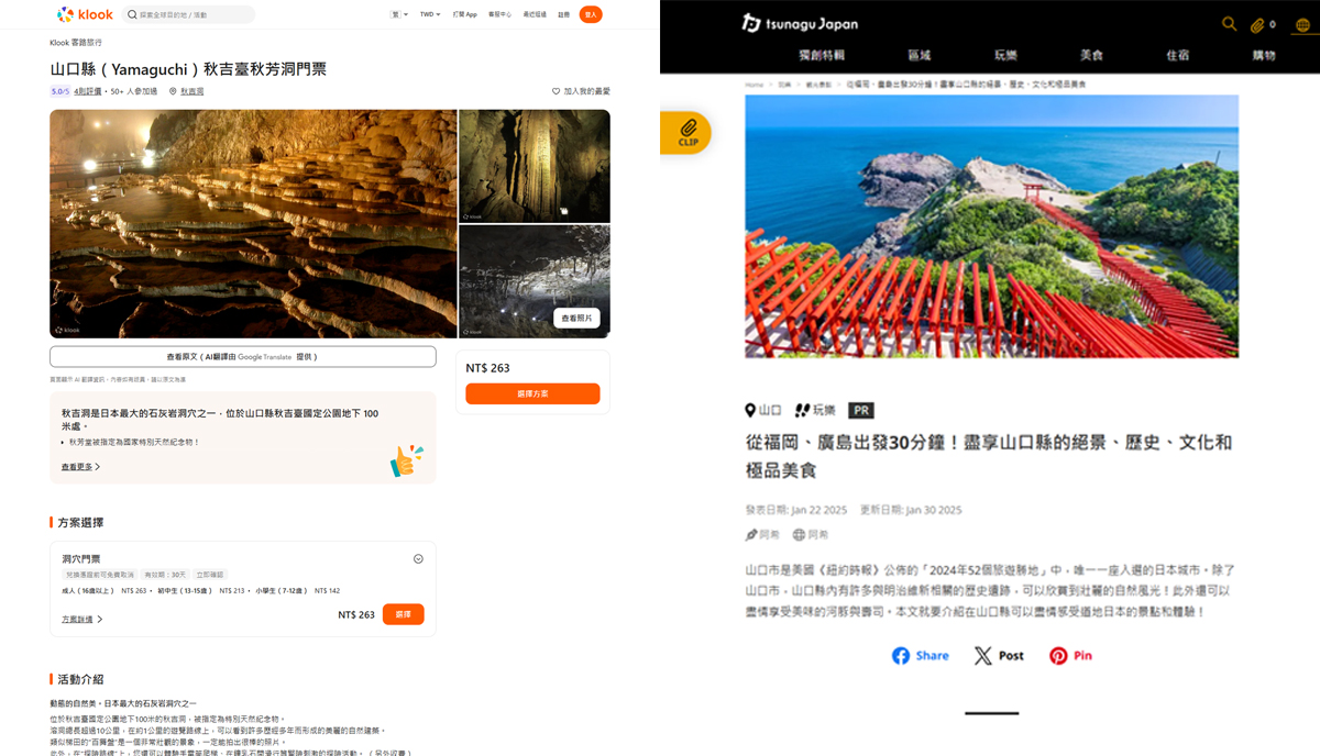 山口県の観光情報を発信するために、台湾・韓国・香港・中国・タイ・シンガポールに向けたWeb・SNS広告を運用。加えて、県内事業者に向けたOTA登録およびインバウンド知識の向上を目的としたセミナーを、海外OTAサイト「Klook」と連携して実施。また独自提案として訪日観光メディア「tsunagu Japan」へ、特集記事を2本×5言語で掲載。